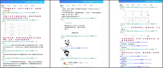 线上教学第一周,为了方便教学工作的开展,也为了帮助员工更快适应并进入学习的正常轨道,第一时间加入班级官方群,了解所有班级员工基本信息,特别是确保每一位员工加入本课程的线上学习平台,同时上传《原理》课程员工线上学习手册,并以线上语音辅导的形式针对线上学习总体要求以及员工遇到的问题作具体讲解。在发布第一周教学内容与安排的同时,创建2020《原理》班级学委群,通过各班级学委适时向所在班级发布通知并反馈学习问题。随后,为避免信息扎堆造成员工目不暇接,根据实际需要,在教学第二周立即创建六个独立的《原理》班级教学群。每周的教学计划与安排都是通过各个班级群平台准时发布,其中包括教学内容与系统开放时间,教学任务点的分布与介绍、线上辅导内容与时间公告等。