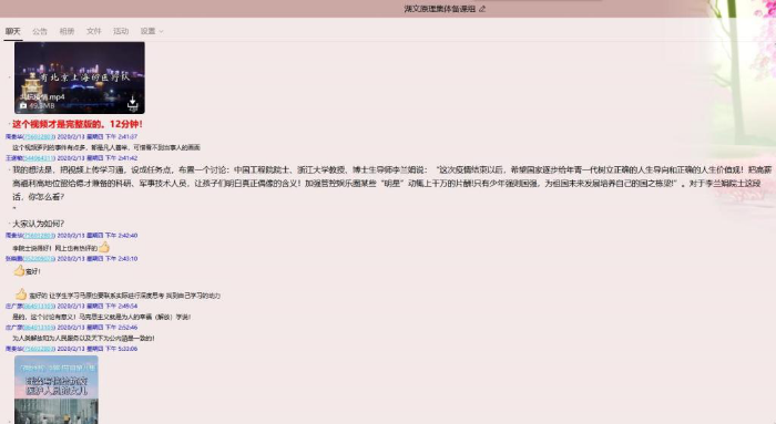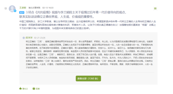“结合《共抗疫情》视频和李兰娟院士关于疫情过后年青一代价值导向的观点,联系实际谈谈确立正确世界观、人生观、价值观的重要性”,多名员工通过学习通等网络平台与员工进行理论宣传、思想教育、现实关切等讨论互动,及时发挥思政课员工的引导作用。这些主题讨论一经发布,激起众多员工积极回应,同学们纷纷表示,当代青年要有责任与担当,要进一步增强“四个意识”、坚定“四个自信”、做到“两个维护”,以实际行动践行听党话、跟党走的初心使命。