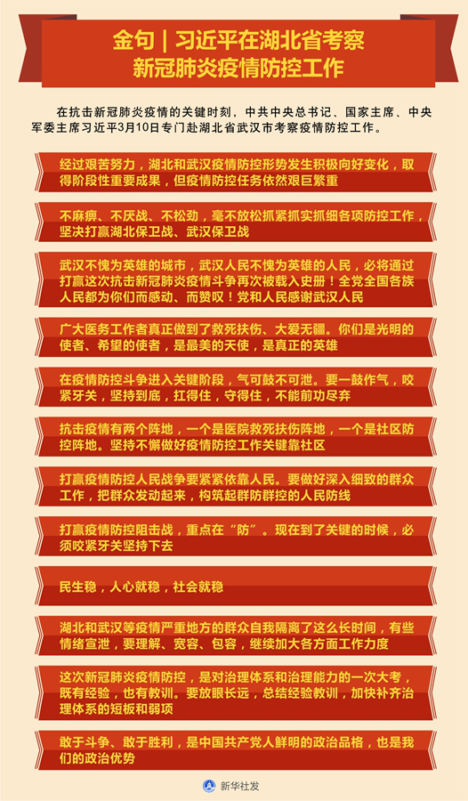 新华社武汉310日电 在抗击新冠肺炎疫情的关键时刻,中共中央总书记、国家主席、中央军委主席习近平10日专门赴湖北省武汉市考察疫情防控工作。他强调,湖北和武汉是这次疫情防控斗争的重中之重和决胜之地。经过艰苦努力,湖北和武汉疫情防控形势发生积极向好变化,取得阶段性重要成果,但疫情防控任务依然艰巨繁重。越是在这个时候,越是要保持头脑清醒,越是要慎终如始,越是要再接再厉、善作善成,继续把疫情防控作为当前头等大事和最重要的工作,不麻痹、不厌战、不松劲,毫不放松抓紧抓实抓细各项防控工作,坚决打赢湖北保卫战、武汉保卫战。